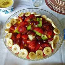 Fruit salad is a dish consisting of various kinds of fruit, sometimes served in a liquid, either in their own juices or a syrup. When served as an appetizer or as a dessert, a fruit salad is sometimes known as a fruit cocktail or fruit cup. In different forms fruit salad can be served as an appetizer, a side-salad, or a dessert.